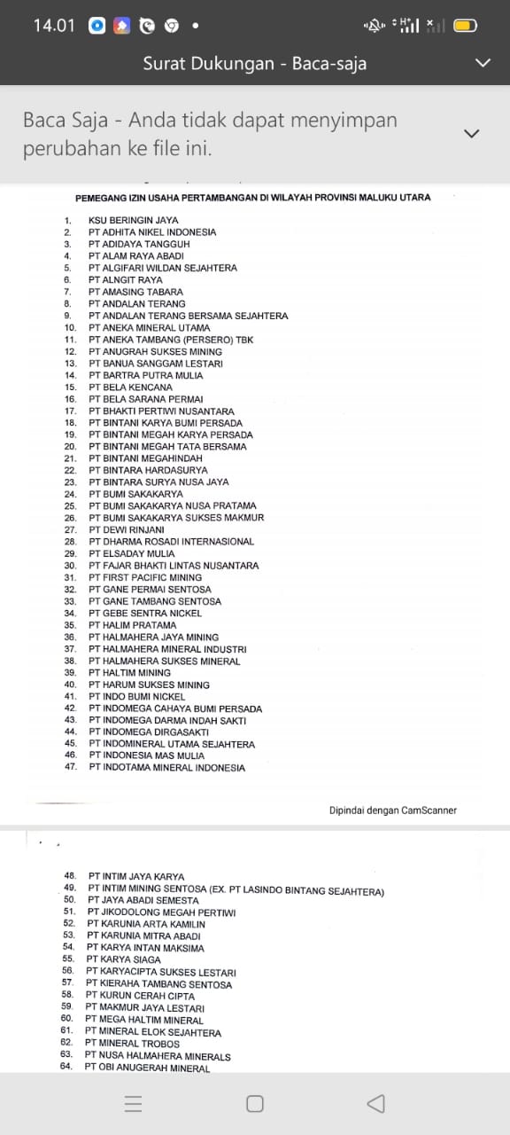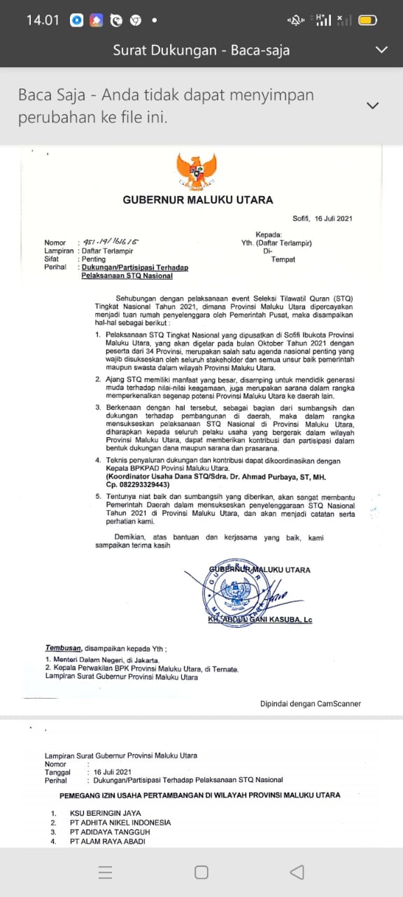 SOFIFI, NUANSA – Pada 16 Juli 2021, Pemerintah Provinsi (Pemprov) Maluku Utara (Malut) mengeluarkan surat yang ditujukan ke 97 perusahaan pertambangan di Maluku Utara. Surat tersebut ditandatangani Gubernur Maluku Utara, Abdul Gani Kasuba, dengan nomor 451. 14/1616/5, perihal dukungan/pastisipasi terhadap pelaksanaan seleksi tilawatil qura’an (STQ) nasional.
