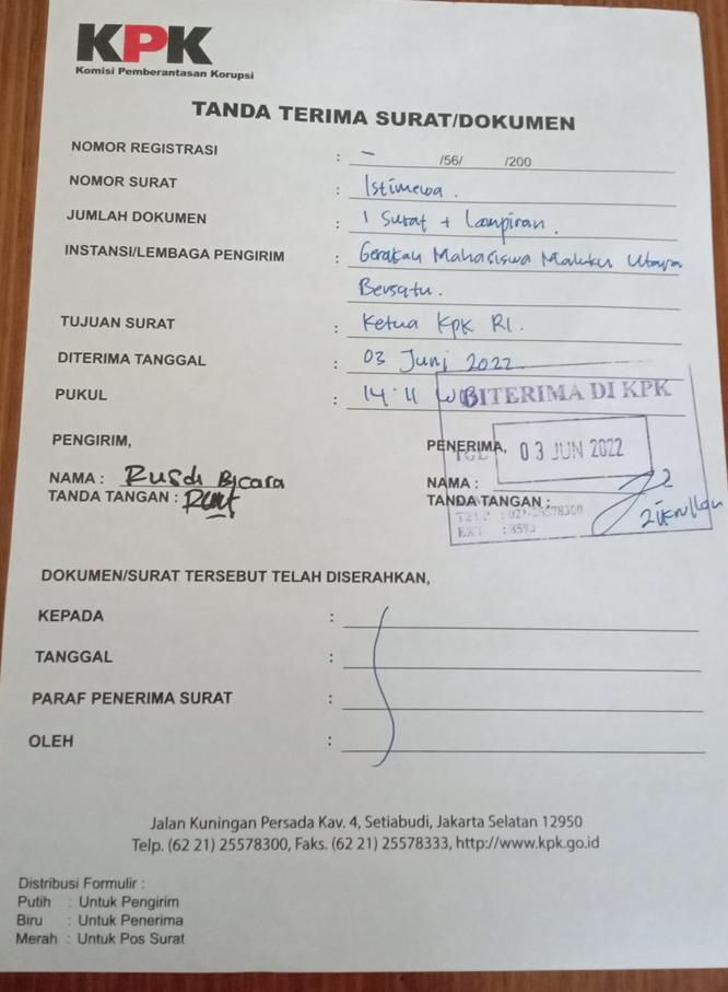 JAKARTA, NUANSA – Gerakan Mahasiswa Maluku Utara Bersatu (GMMUB) melaporkan secara resmi tiga dugaan korupsi di Pemprov Maluku Utara (Malut) ke Komisi Pemberantasan Korupsi (KPK) pada Jumat (3/6). Laporan dengan nomor resgister 56/200 itu diserahkan oleh coordinator GMMUB, Rusdi B.