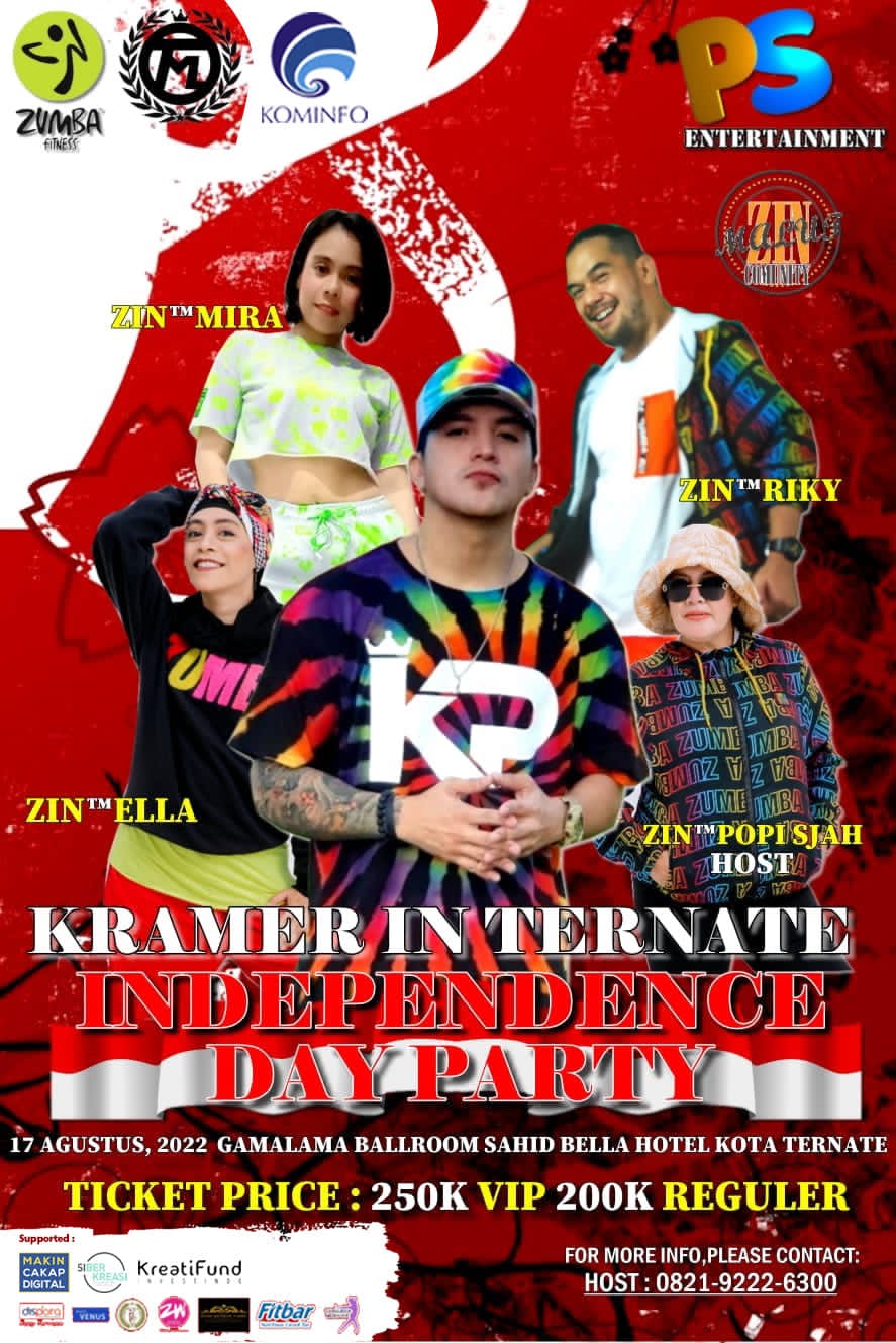 NUANSA, TERNATE – Zumba Party atau Independence Day Party akan digelar pada Rabu 17 Agustus 2022 mulai pukul 13.00-17.00 WIT di Gamalama Ballroom Sahid Hotel Ternate. Kegiatan itu merupakan salah satu cara memeriahkan hari ulang tahun (HUT) Kemerdekaan RI ke-77 dengan dua instruktur bertaraf internasional yang didatangkan langsung dari Filipina.