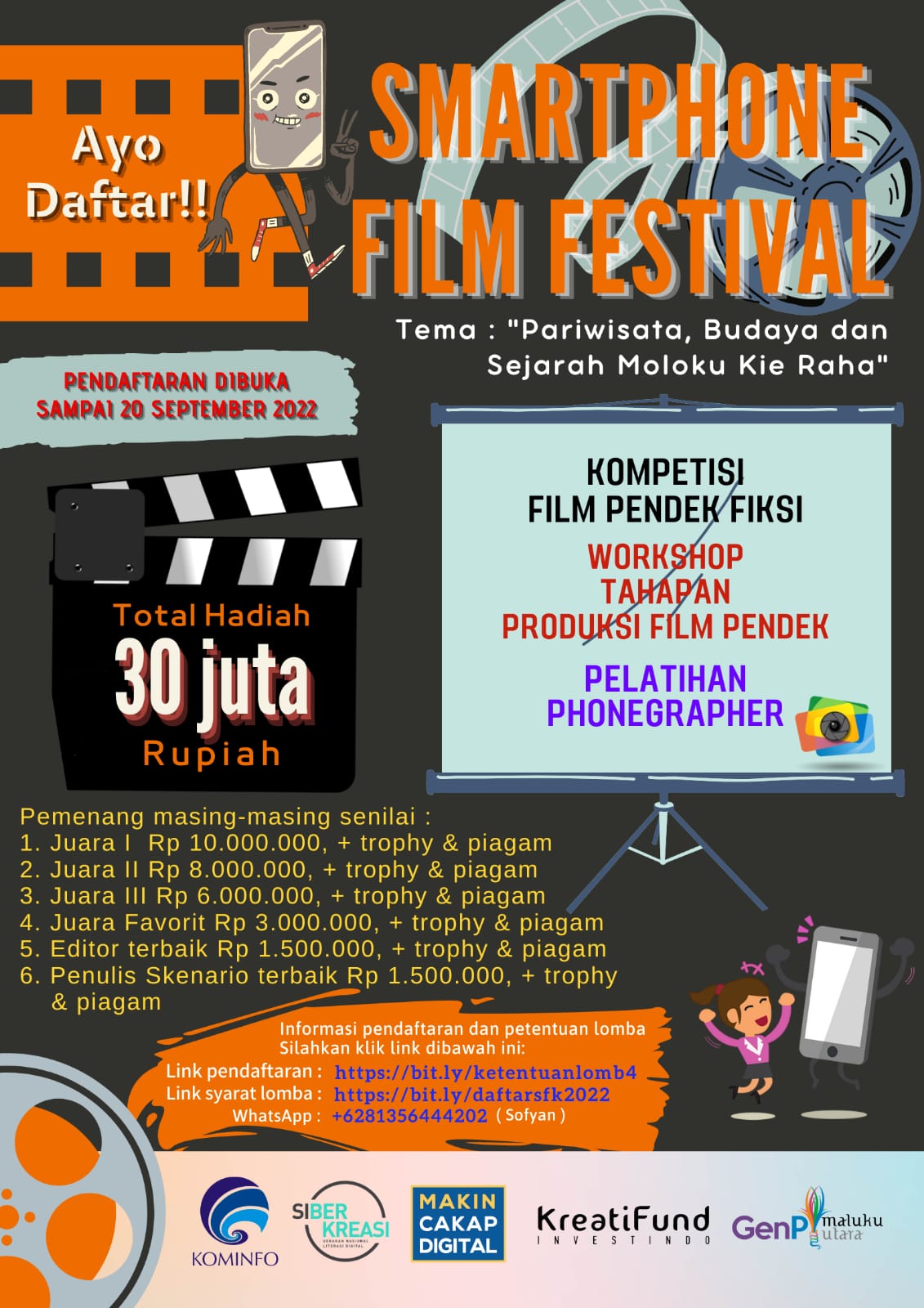 Sofyan Ansar selaku Manager Event, Talent dan Kreator Literasi Digital Maluku Utara mengatakan, generasi muda Maluku Utara dalam berbagai kesempatan kompetisi di tingkat nasional baik yang diselenggarakan oleh pemerintah maupun swasta telah membuktikan kemampuannya dengan menjuarai berbagai gelaran event kompetisi tersebut. Hal ini haruslah terus didorong untuk meningkatkan peran dan kreatifitas mereka khuusnya di jalur perfilman. Sofyan yang juga ketua Generasi Pesona Indonesia (Genpi) Maluku Utara itu menuturkan, di era digital saat ini, memproduksi sebuah film pendek tidak lagi harus menggunakan peralatan yang canggih, tapi dengan bermodalkan smartphone, para sineas sudah bisa memproduksi sebuah karya film dengan hasil yang maksimal. Lanjutnya, hal-hal yang berkaitan dengan informasi pendaftaran dan ketentuan lomba, silakan klik link berikut, link pendaftaran: https://bit.ly/daftarsfk2022 dan untuk link ketentuan lomba dapat diakses melalui link: https://bit.ly/ketentuanlomb4. Untuk informasi lainnya dapat pula dihubungi whatsApp: +62 8135 5644 202 (Opan Jacky), pungkas Sofyan.