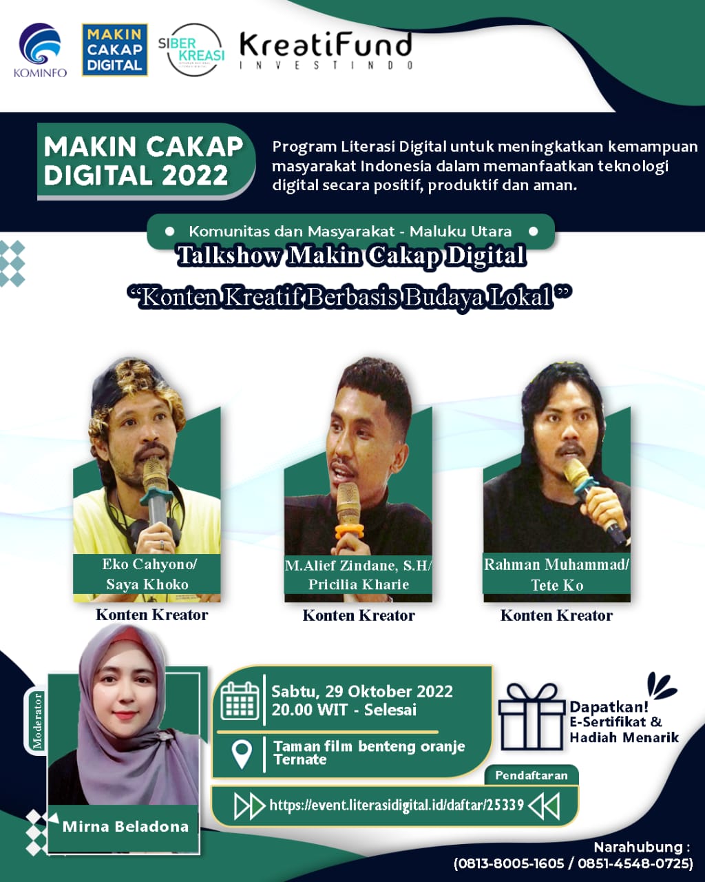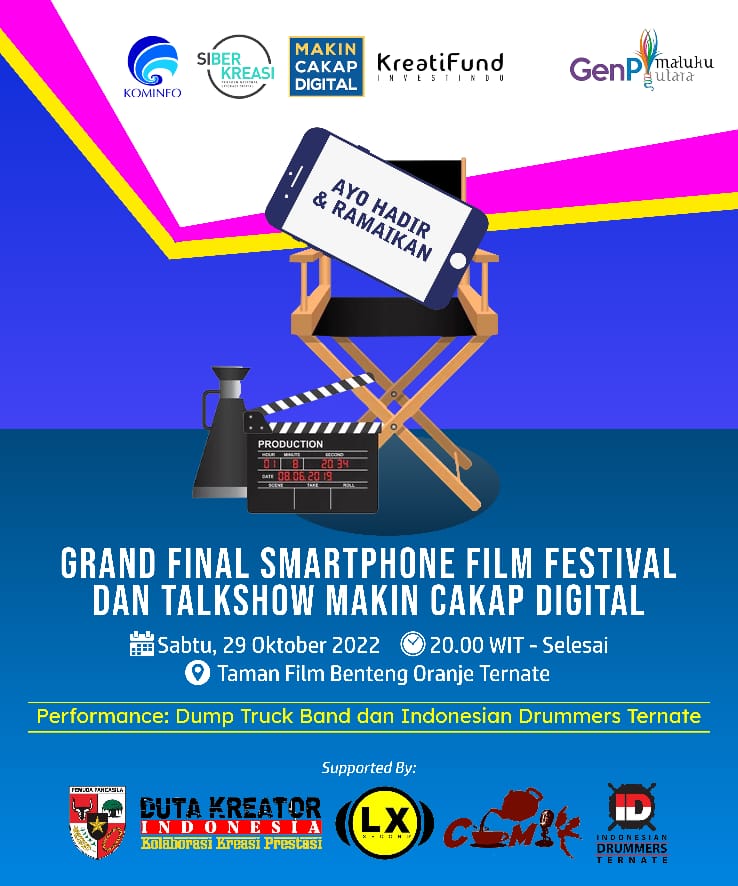 Dalam kaitannya dengan kampanye makin cakap digital, maka propaganda sangatlah diperlukan termasuk melalui peran para konten kreator maupun melalui peran-peran dari para pekerja film. Oleh sebab itu, manajemen project Literasi Digital Maluku Utara akan meggelar Grand Final Smartphone Film Festival dan Talkshow makin cakap digital bertajuk Konten Kreatif Berbasis Budaya Lokal yang akan digelar di Taman Film Benteng Oranje Ternate pada hari Sabtu, (29/10) pukul 20.00 WIT.