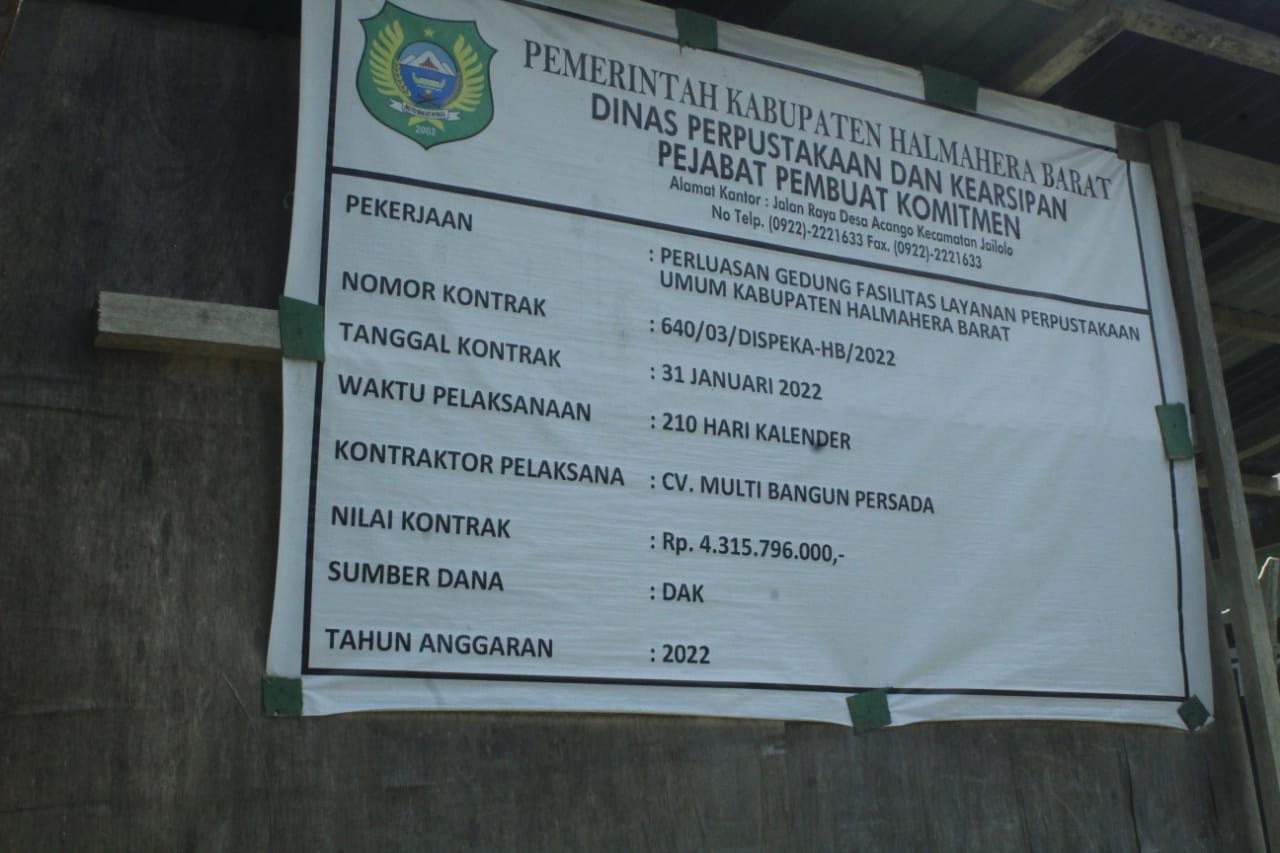 JAILOLO, NUNASA – Sebuah proyek di Kabupaten Halmahera Barat (Halbar) tampak terbengkalai. Kegiatan yang bersumber dari Dana Alokasi Khusus (DAK) senilai Rp 4 miliar lebih itu untuk pembangunan sebuah gedung dua lantai yang dikerjakan CV Multi Bangun Persada. Akibat pekerjaannya yang diduga terbengkalai, penegak hukum mulai mengumpulkan data menyangkut proyek itu.