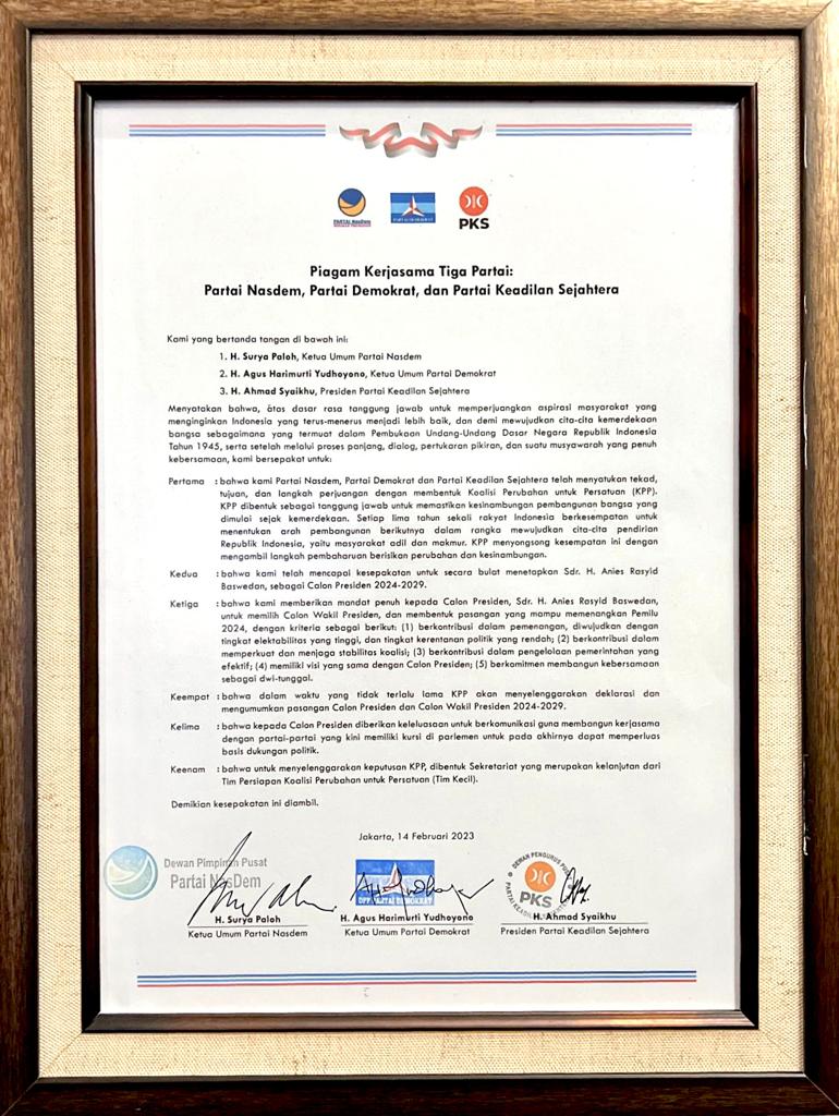 Tiga partai politik yang telah memberikan dukungan resmi dan mencalonkan Anies Baswedan sebagai calon presiden 2024-2029 telah menandatangani dokumen kesepakatan yang diberi nama “Piagam Kerjasama Tiga Partai: Partai Nasdem, Partai Demokrat, dan Partai Keadilan Sejahtera”.