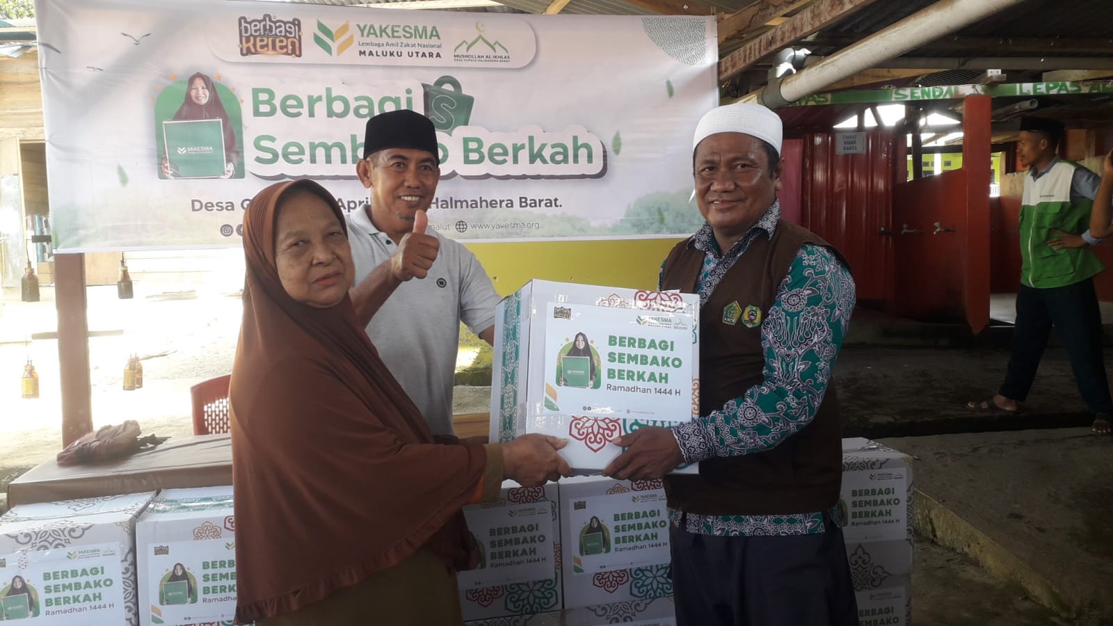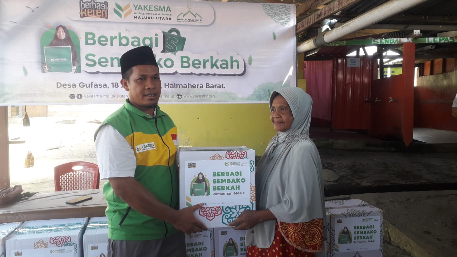 JAILOLO, NUANSA – Kantor Layanan Yakesma Halmahera Barat, mendistribusikan 38 paket sembako berkah untuk keluarga duafa di Musala Al-Ikhlas, Desa Gufasa, Kecamatan Jailolo, Kabupaten Halmahera Barat, Selasa (18/4).