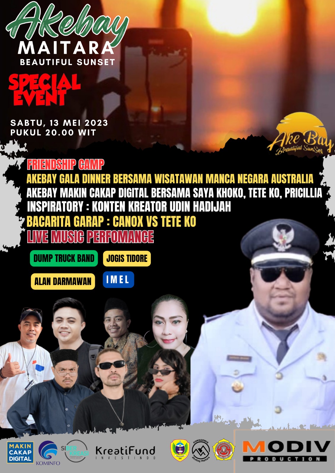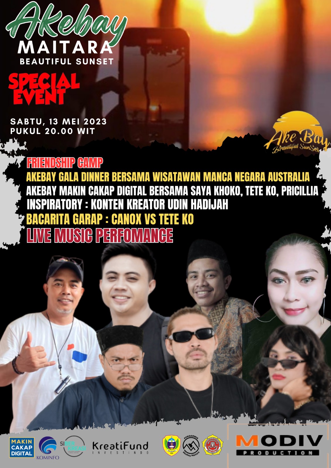 Kampanye Makin Cakap Digital yang akan dipandu oleh Maaesara (moderator) ini, akan berlangsung pada Sabtu, (13/5) pukul 20.00 WIT di pantai Desa Wisata Akebay, Pulau Maitara, Kota Tidore Kepulauan). Kegiatan ini mengusung tema “Temu Konten Kreator dan Talkshow Tidore Makin Cakap Digital,