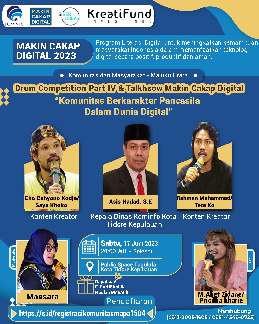 Talkshow makin cakap digital sendiri akan digelar dengan tema “Komunitas Berkarakter Pancasila Dalam Dunia Digital”, dengan menghadirkan para narasumber antara lain: Asis Hadad (Kepala Dinas Kominfo Kota Tidore Kepulauan), Eko Cahyono Kotja/Saya Khoko (konten kreator), Rahman Muhammad/Tete Ko (konten kreator), M Alif Zidane/Procillia Kharie (konten kreator), dan akan dipandu langsung oleh Maesara.