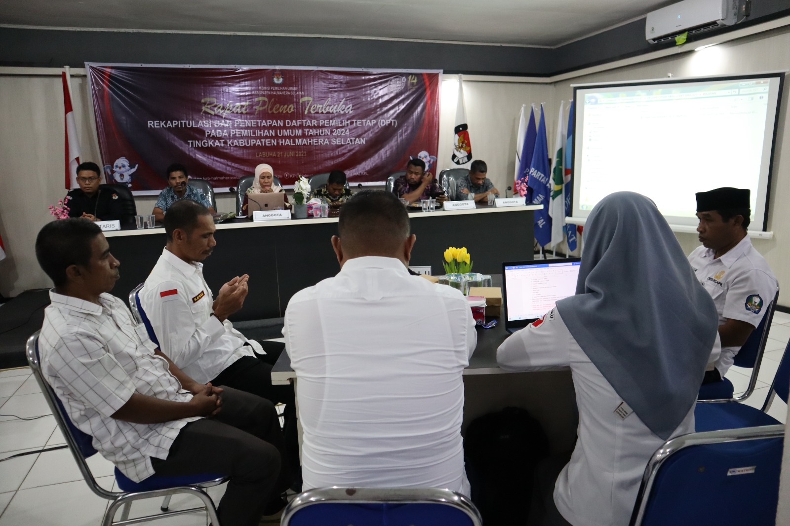 LABUHA, NUANSA – Komisi Pemilihan Umum (KPU) Kabupaten Halmahera Selatan menggelar rapat pleno terbuka rekapitulasi dan penetapan daftar pemilih tetap (DPT) pada pemilu 2024 mendatang, Rabu (21/6) di aula Husni Kamil Manik Kantor KPU Halsel.