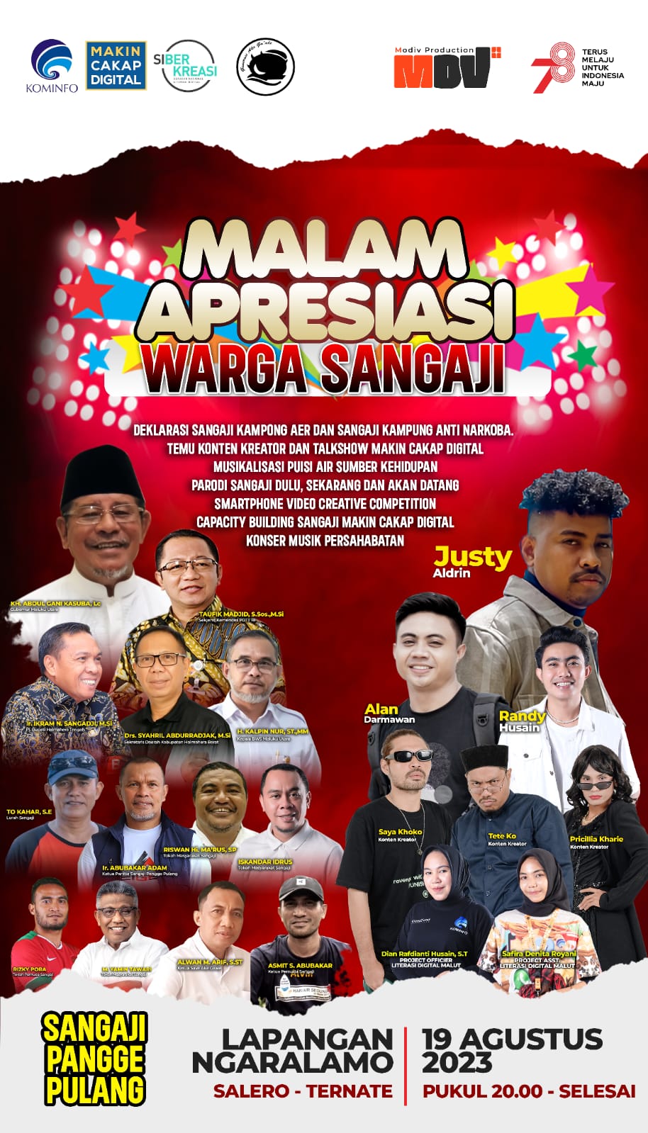 Project officier Literasi Digital Provinsi Maluku Utara, Dian Rafdianti Husain mengungkapkan, gelaran malam apresiasi warga Sangadji atau Sangadji Pangge Pulang akan menghadirkan para konten kreator dan stakeholder terkait sebagai narasumber pada gelaran talkshow makin cakap digital bertajuk; Memanfaatkan Media Sosial Untuk Promosi Destinasi Pariwisata, Seni dan Budaya, antara lain: Tahmid Wahab (Kadis Pariwisata dan Ekraf Maluku Utara), Eko Cahyono Kodja / Saya Khoko (Konten Kreator), Rahman Muhammad / Tete Ko ( Konten Kreator), Nazlatan Ukhra Kasuba (Inspiratory), akan dipandu oleh Echa Maesara (selaku moderator) dan Master of Ceremonynya adalah Pricillia Kharie / Konten Kreator