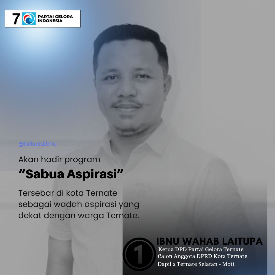 “Sabua Aspirasi adalah gagasan yang ingin saya realisasikan bersama Partai Gelora di Kota Ternate. Sabua Aspirasi akan kami sebar di banyak tempat di Kota Ternate, agar dekat dengan masyarakat dan menjadi titik rangkum semua aspirasi, pengaduan atau keluhan dari masyarakat,” ujar Ketua Partai Gelora Kota Ternate, Ibnu Wahab Laitupa kepada Nuansa Media Grup (NMG), Senin (30/10).