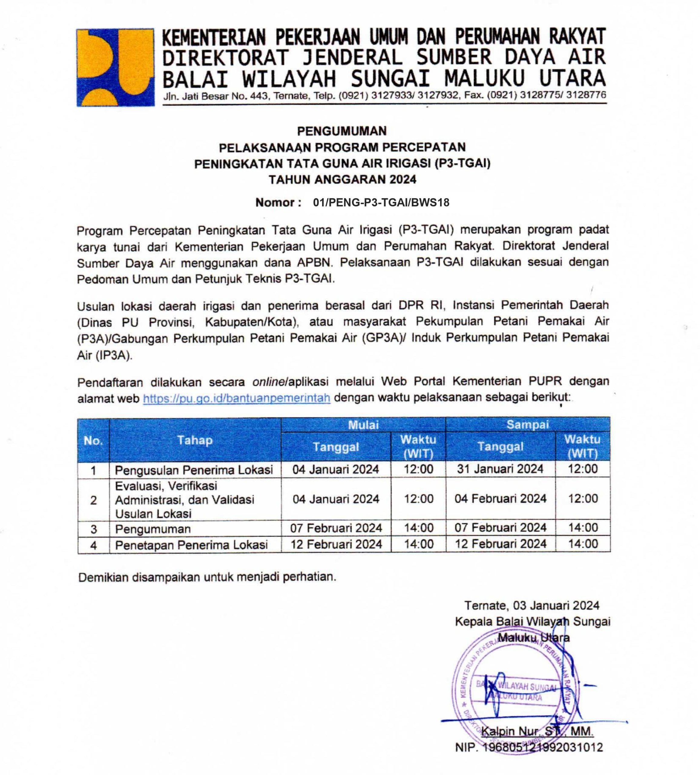 Hal itu disampaikan Kepala BWS Malut, Kalpin Nur, sesuai dengan Pengumuman P3-TGAI dengan nomor: 01/PENG-P3-TGAI/BWS18 tertanggal 3 Januari 2024, yang menjelaskan bahwa pendaftaran lokasi daerah irigasi dan penerima berasal dari DPR RI, Instansi Pemerintah Daerah seperti Dinas PUPR Provinsi dan Kabupaten/Kota, atau masyarakat Perkumpulan Petani Pemakai Air (P3A) atau Gabungan Perkumpulan Petani Pemakai Air (GP3A) atau Induk Perkumpulan Petani Pemakai Air (IP3A).