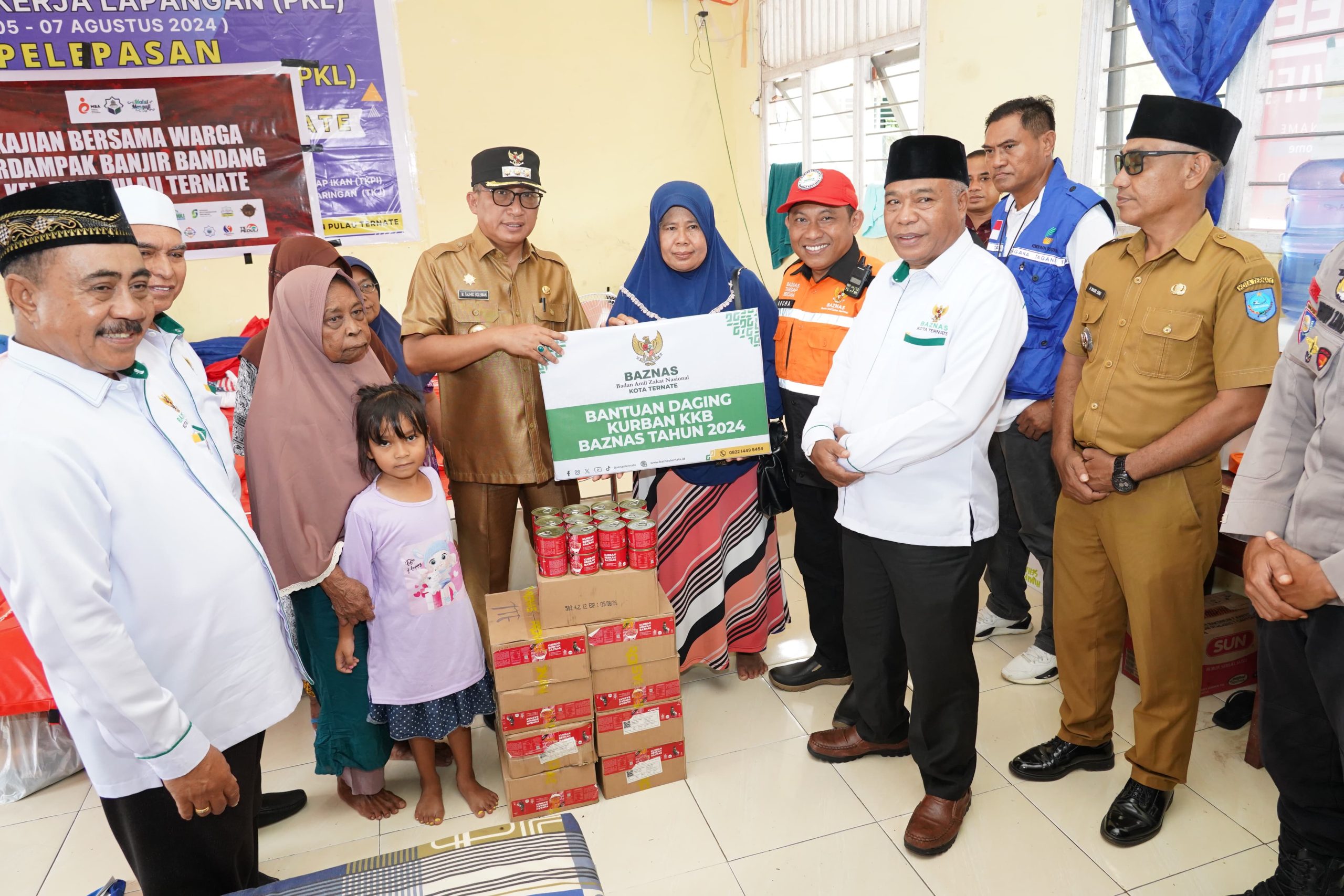 TERNATE, NUANSA – Wali Kota Ternate, M Tauhid Soleman, menyerahkan secara simbolis bantuan paket daging kurban dari Badan Amil Zakat Nasional (Baznas) Republik Indonesia sebanyak 250 kaleng kepada para pengungsi yang terdampak bencana banjir bandang di Kelurahan Rua, Kecamatan Pulau Ternate, Selasa (3/9).