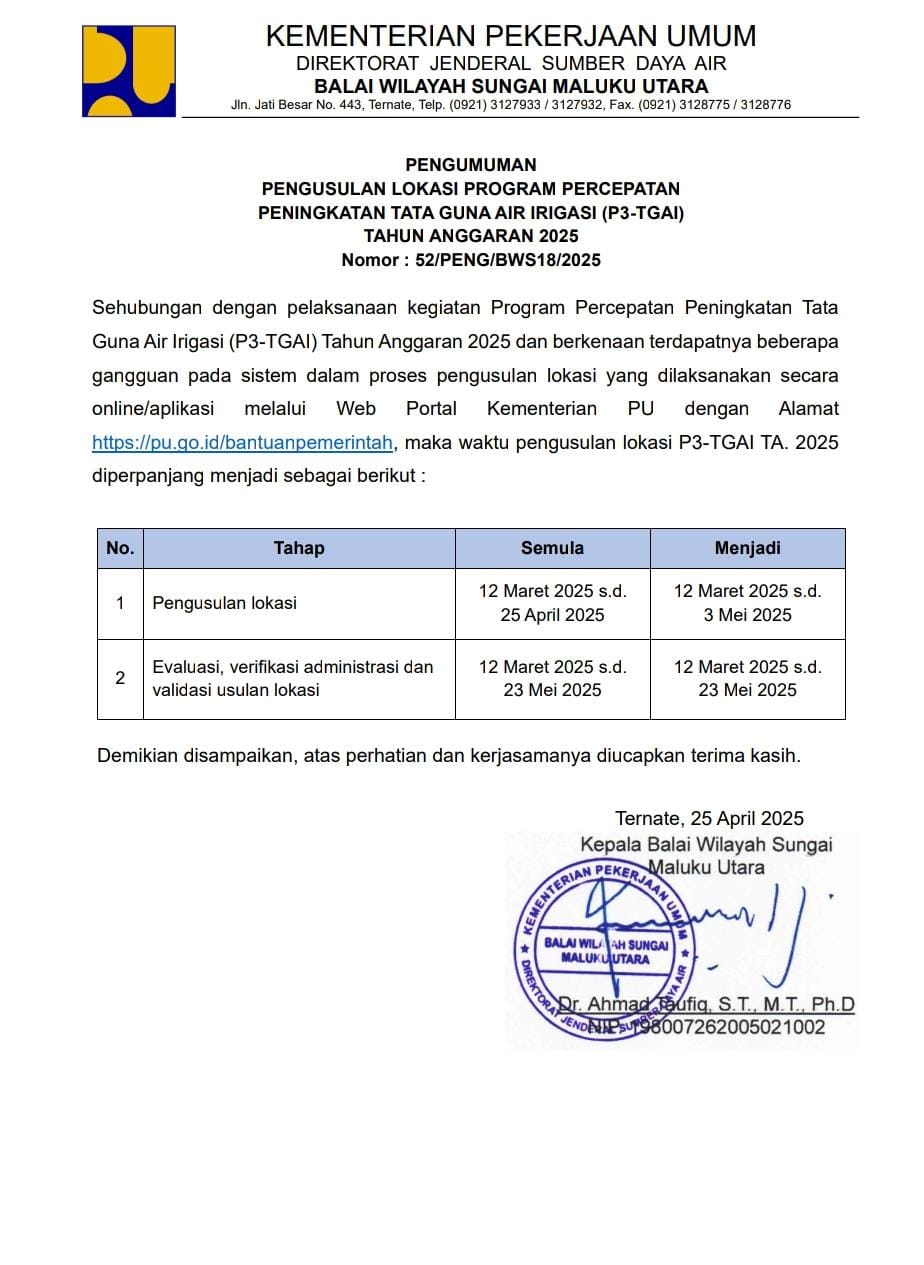Perubahan jadwal P3-TGAI berdasarkan surat dengan nomor 52/PENG/BWS18/2025, tertanggal 25 Maret 2025 yang ditandatangani Kepala BWS Maluku Utara, Ahmad Taufiq.