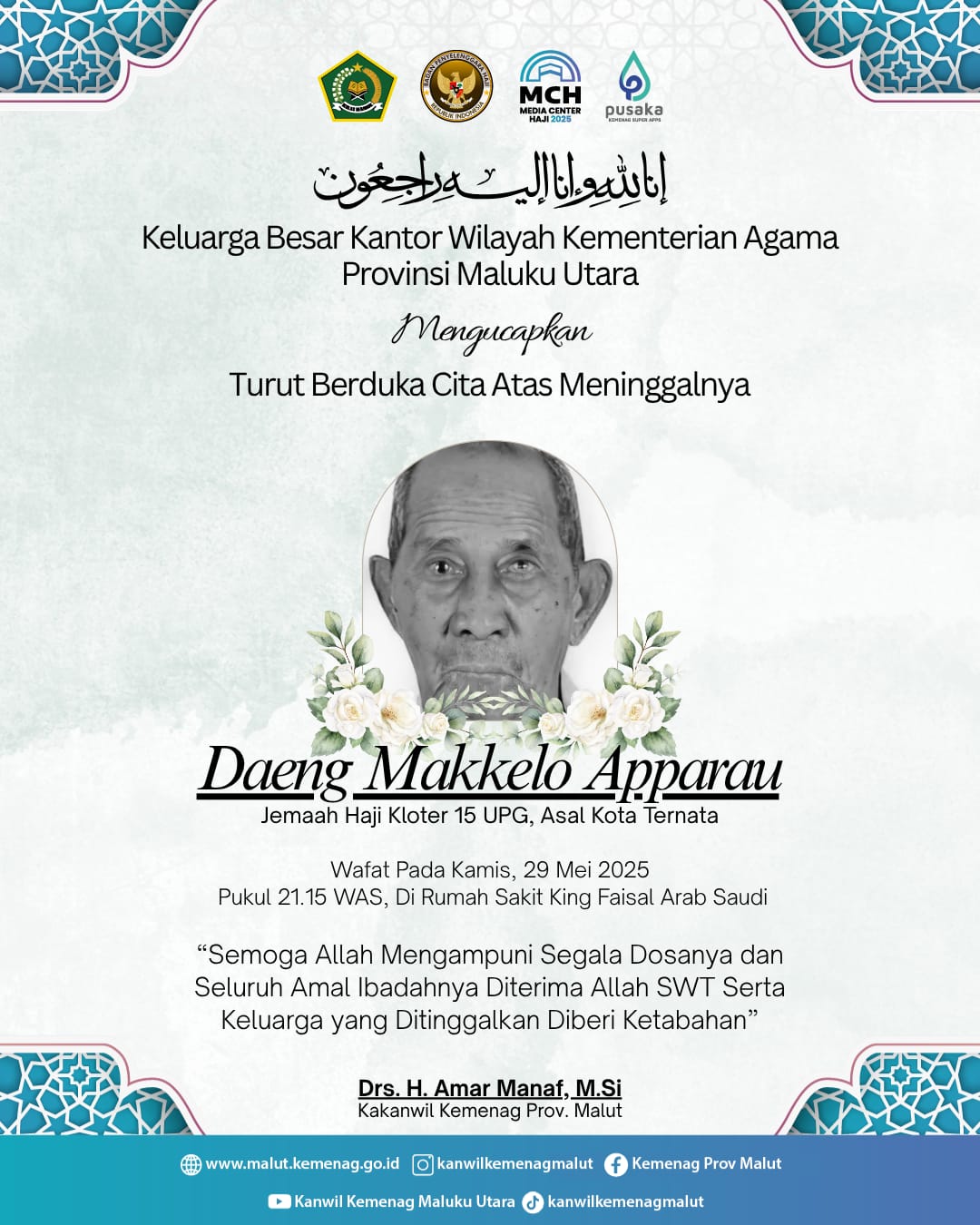 “Kami turut berduka cita yang sedalam-dalamnya atas wafatnya almarhum. Semoga keluarga yang ditinggalkan diberikan ketabahan, dan almarhum mendapat tempat terbaik di sisi Allah SWT,” ucap Kepala Kanwil Kemenag Malut, Amar Manaf, Jumat (30/5).