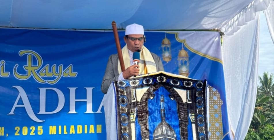 TOBELO, NUANSA – Wakil Bupati Halmahera Utara, Kasman Hi Ahmad, melaksanakan salat Iduladha 1446 H/2025 M di lapangan masjid komplek perumahan Desa Kira, Kecamatan Galela Barat, Jumat (6/6). Khotbah yang disampaikan wakil bupati Kasman Hi Ahmad sangat menyentuh hati ribuan jemaah yang hadir. Kasman Hi menyerukan tentang kehidupan umat manusia yang harus dilandasi oleh nilai-nilai Pancasila yang tentu mempunyai hubungan makna dengan pelaksanaan hari raya Iduladha yang saat ini dirayakan.