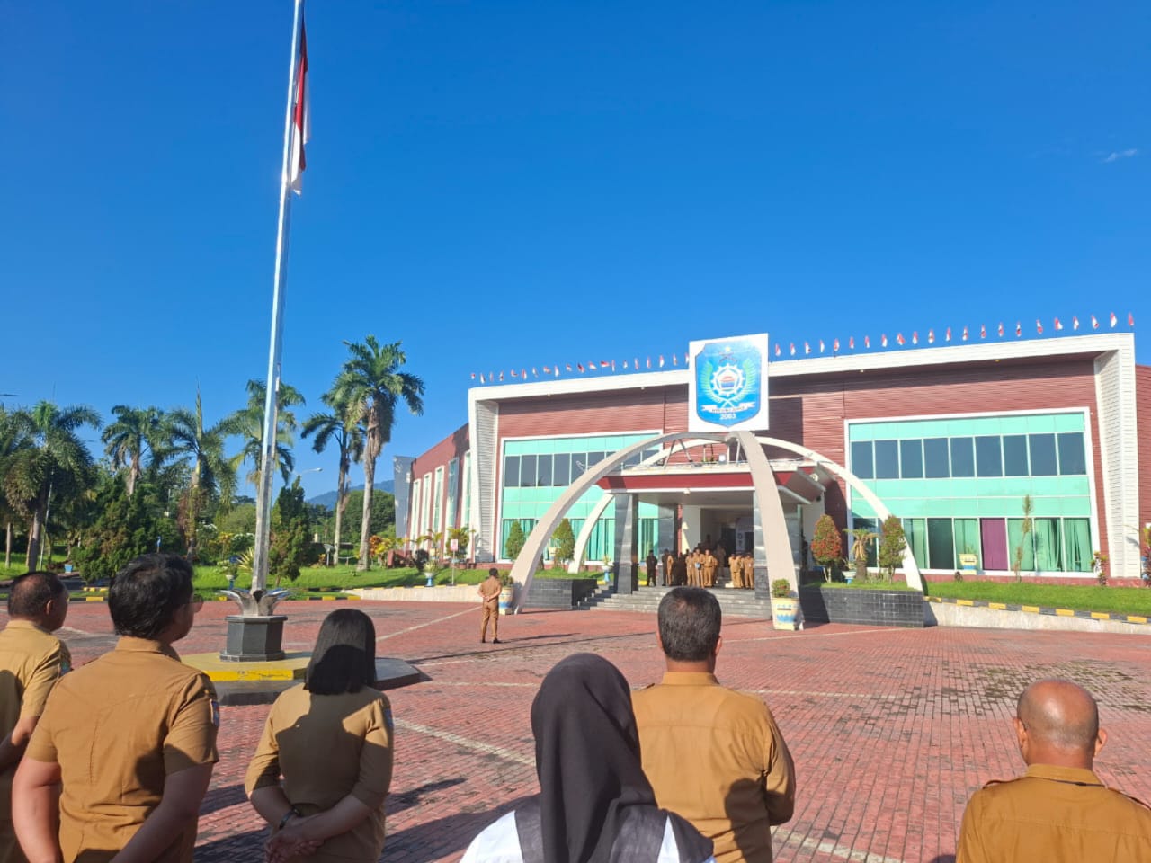 TOBELO, NUANSA – Wakil Bupati Halmahera Utara, Kasman Hi Ahmad, memimpin apel pagi untuk Aparatur Sipil Negara (ASN) di lingkup Pemkab Halut, Senin (29/9) di depan kantor bupati.