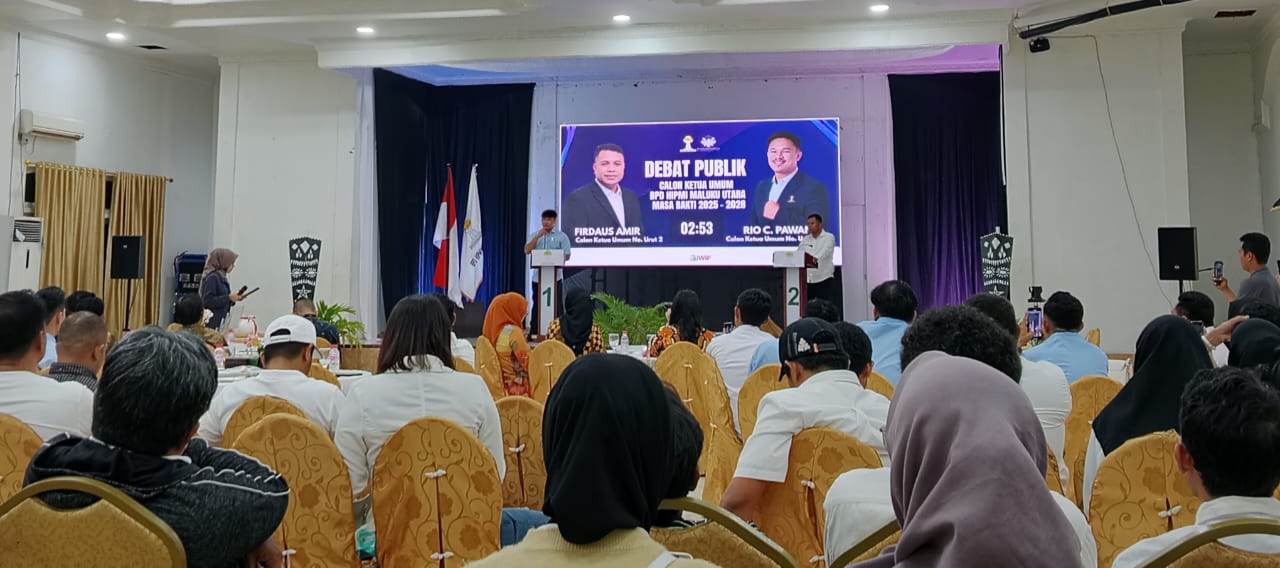 TERNATE, NUANSA – Debat publik calon Ketua Umum BPD Himpunan Pengusaha Muda Indonesia (HIPMI) Maluku Utara masa bakti 2025–2028 berlangsung sengit di Jati Hotel Ternate, Minggu (19/10) malam.