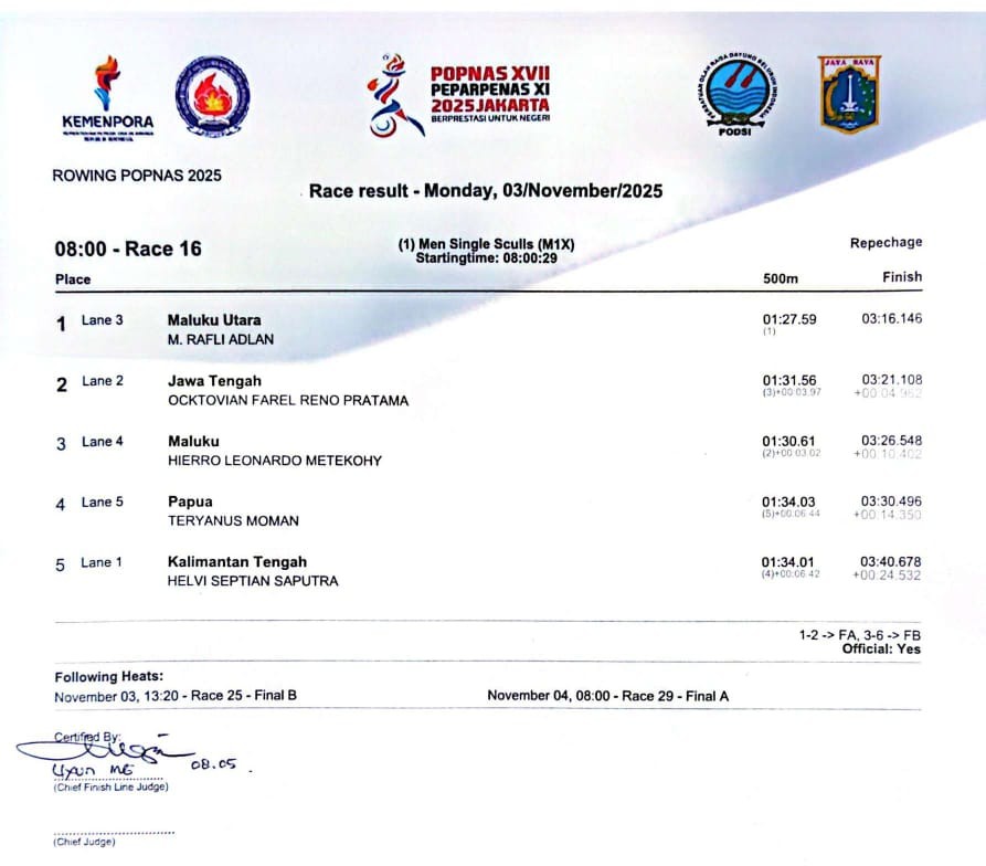 NUANSA, JAKARTA – Kontingen atlet dayung Maluku Utara (Malut) mencatatkan prestasi membanggakan di Pekan Olahraga Pelajar Nasional (POPNAS) XVII 2025 di Jakarta. Setelah melalui babak penyisihan yang ketat, dua nomor perlombaan dayung (rowing) berhasil memastikan tempat di partai final yang akan digelar pada Selasa (4/11) besok.