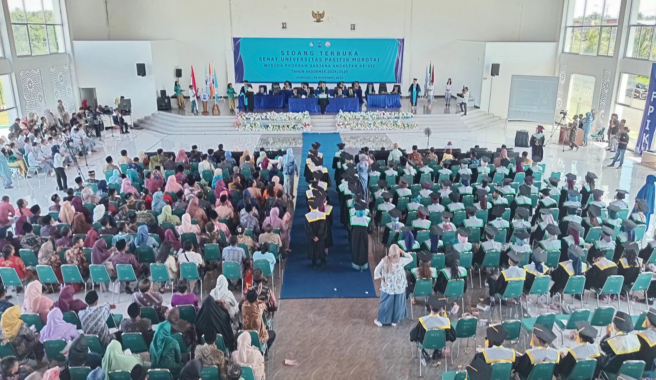 DARUBA, NUANSA – Universitas Pasifik (Unipas) Pulau Morotai menggelar wisuda angkatan ke-VII tahun 2025. Sebanyak 189 sarjana yang terdiri dari 6 fakultas dan 11 program studi ini diwisudakan di gedung Morotai Islamic Center, Kamis (6/11).