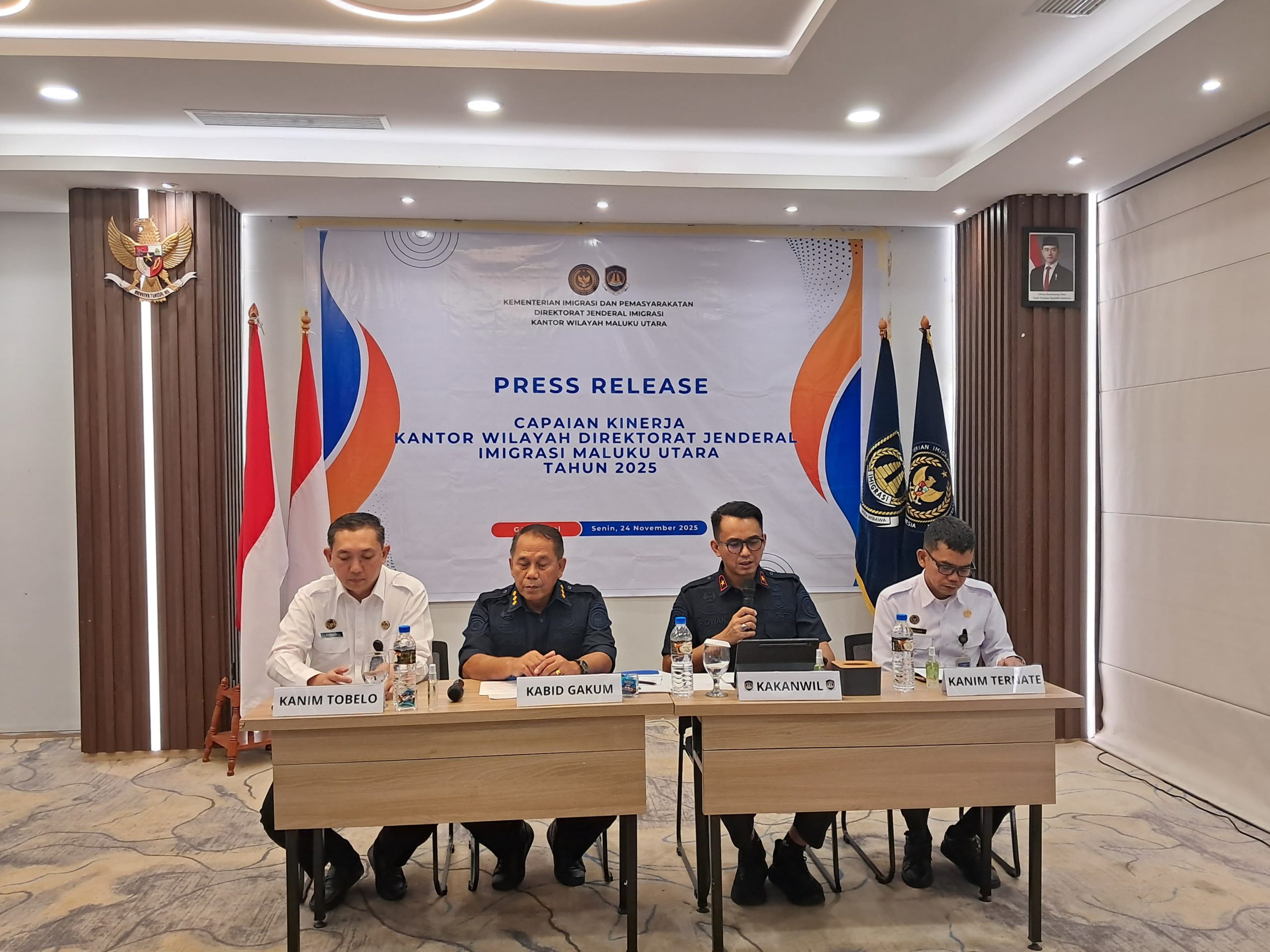 Hal tersebut disampaikan langsung Kepala Kantor Wilayah (Kakanwil) Ditjen Imigrasi Maluku Utara, Mohammad Ridwan, didampingi Kepala Kantor Imigrasi Ternate dan Tobelo saat melakukan press release usai rapat bersama dengan Tim Pengawasan Orang Asing (Timporas) Maluku Utara di Gaia Hotel Ternate, Senin (24/11).