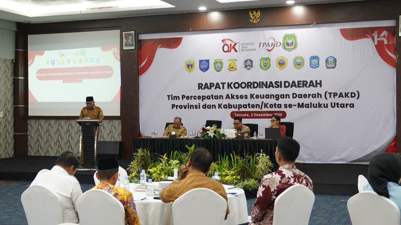 TERNATE, NUANSA – Sekretaris Provinsi (Sekprov) Maluku Utara, Samsuddin Abdul Kadir, resmi membuka kegiatan rapat koordinasi Tim Percepatan Akses Keuangan Daerah (TPAKD), yang merupakan kolaborasi antara Pemerintah Provinsi Maluku Utara dan Otoritas Jasa Keuangan (OJK) Malut bersama kabupaten/kota sebagai bagian dari strategi nasional dalam meningkatkan inklusif keuangan masyarakat. Rakorda TPAKD ini dilaksanakan di Muara Hotel Ternate, Selasa (2/12).