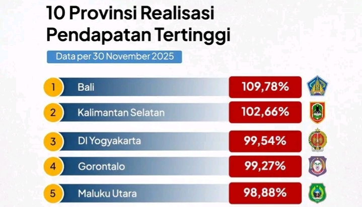 Dalam data tersebut, Maluku Utara membukukan realisasi pendapatan sebesar 98,88 persen. Capaian ini menempatkan Maluku Utara di bawah Bali yang berada di posisi teratas dengan realisasi 109,78 persen, disusul Kalimantan Selatan 102,66 persen, DI Yogyakarta 99,54 persen, dan Gorontalo 99,27 persen.