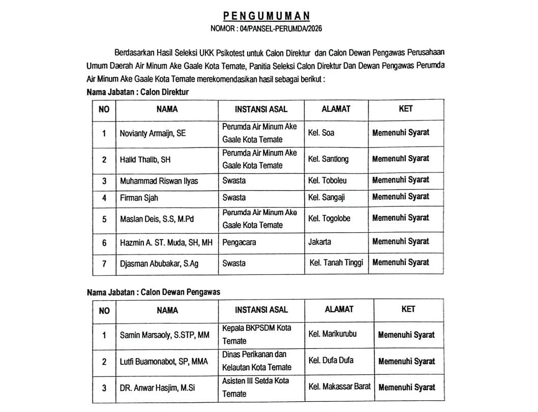 TERNATE, NUANSA – Panitia Seleksi Direktur dan Dewan Pengawas (Dewas) Perusahan Umum Daerah (Perumda) Air Minum Ake Gaale Kota Ternate melalui tim seleksi (assessor) mengumumkan tahapan seleksi Uji Kelayakan dan Kepatutan (UKK) Psikotes yang diikuti 10 peserta.