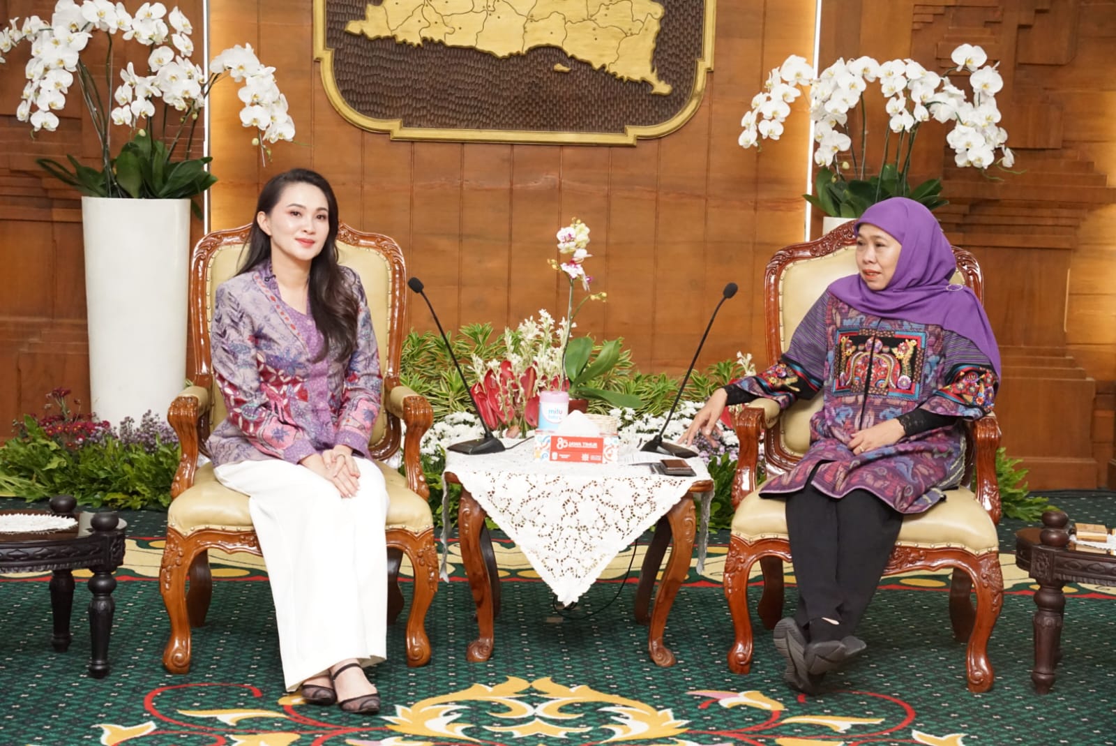 SURABAYA, NUANSA – Gubernur Jawa Timur Khofifah Indar Parawansa menerima kunjungan Gubernur Maluku Utara Sherly Tjoanda di Gedung Negara Grahadi, Surabaya, Sabtu (28/2).
