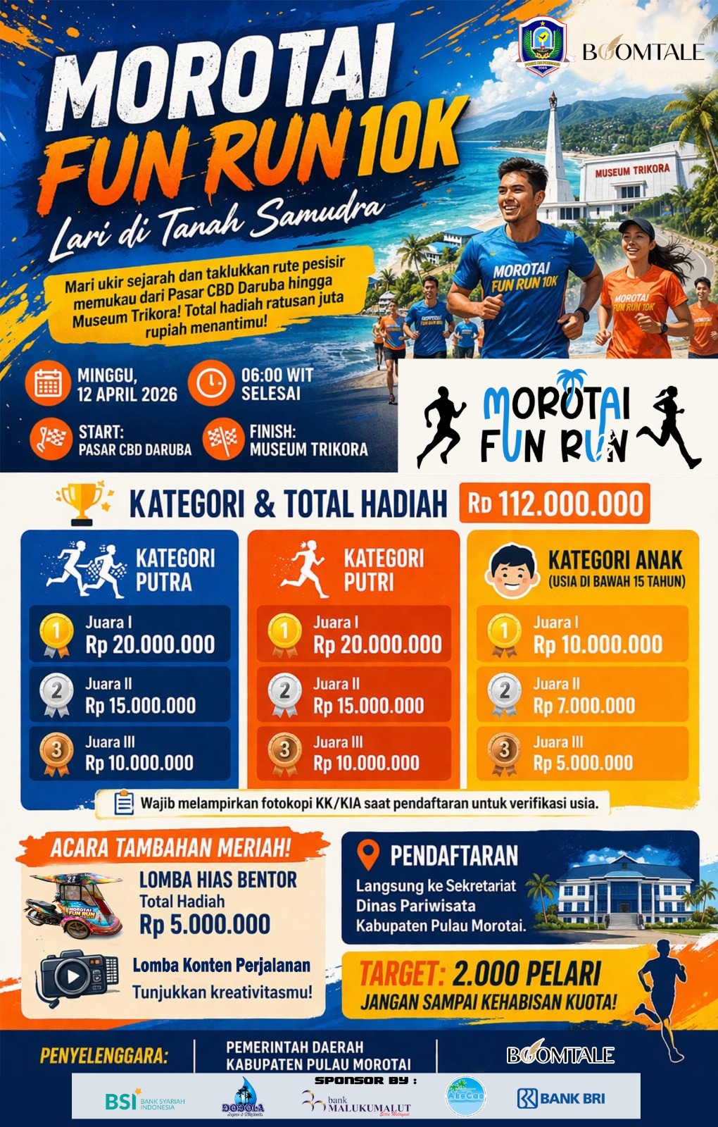 Event ini akan digelar pada Minggu, 12 April 2026, mulai pukul 06.00 WIT dengan rute eksotis dari Pasar CBD Daruba hingga Museum Trikora. Para pelari akan disuguhkan panorama laut biru Morotai yang memukau, menjadikan setiap langkah terasa istimewa dan tak terlupakan.