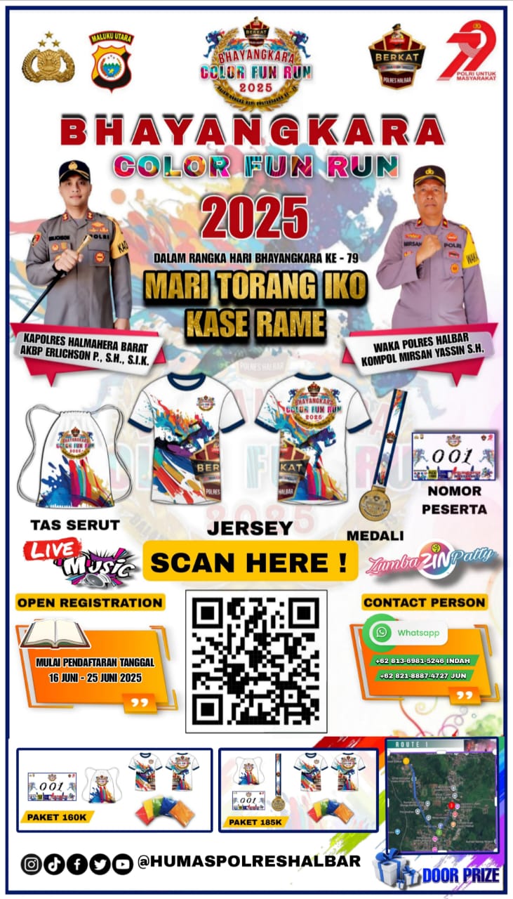 JAILOLO, NUANSA – Dalam rangka memperingati Hari Bhayangkara ke-79, Polres Halmahera Barat menggelar berbagai rangkaian kegiatan. Salah satunya adalah kegiatan Bhayangkara Color Fun Run 2025. Acara ini akan digelar secara meriah dan penuh warna.
