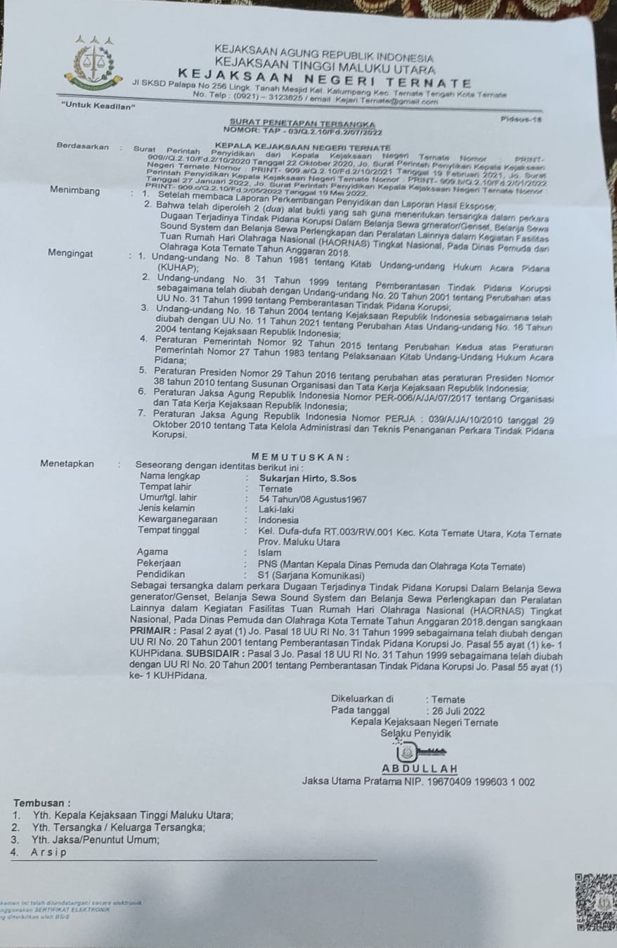 Penetapan SH sebagai tersangka ini berdasarkan surat Kepala Kejari Ternate, Abdullah dengan nomor TAP-03/Q.2.10/F.d/07/2022 yang ditandatangi langsung Kajari Ternate, Abdullah. Surat penetapan tersangka terhadap Sukarjan Hirto tersebar luas di dunia maya.